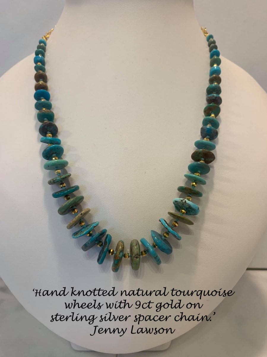 Hand knotted natural turquoise wheels with 9ct gold on sterling silver spacers chain an clasp
